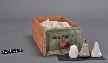 Schublade aus Nadelholz mit rotem Knauf und profilierter Vorderseite, unregelmäßigem Grundriss, individuell an den Schrank angepasst. Gezinkte Verbindungen (Schwalbenschwanzverbindung). Boden angeleimt. Vorderfront grün, mit schwarzer Signatur händisch beschriftet. Enthält Alaunzucker in Hütchenform, einige in Papier verpackt.
