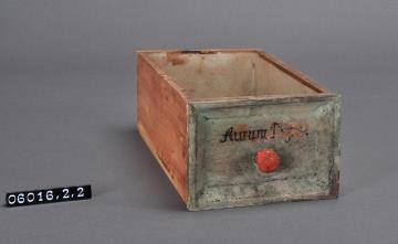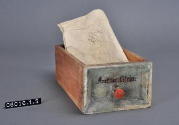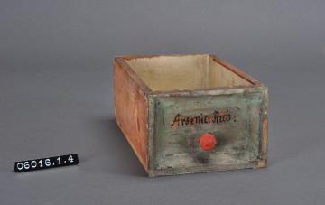 Schublade aus Nadelholz mit rotem Knauf und profilierter Vorderseite, unregelmäßigem Grundriss, individuell an den Schrank angepasst. Gezinkte Verbindungen (Schwalbenschwanzverbindung). Boden angeleimt. Innenseite mit grauem Papier ausgeklebt. Vorderfront grün, mit schwarzer Signatur händisch beschriftet. Enthielt rotes Arsenik.