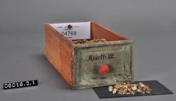Schublade aus Nadelholz mit rotem Knauf und profilierter Vorderseite, unregelmäßigem Grundriss, individuell an den Schrank angepasst. Gezinkte Verbindungen (Schwalbenschwanzverbindung). Boden angeleimt. Vorderfront grün, mit schwarzer Signatur händisch beschriftet. Enthält Stücke von Naturasphalt in zwei Qualitäten: aus Seefeld und Innsbruck-Kitt(?).