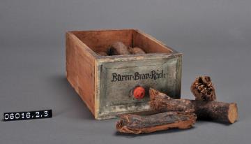 Schublade aus Nadelholz mit rotem Knauf und profilierter Vorderseite, unregelmäßigem Grundriss, individuell an den Schrank angepasst. Gezinkte Verbindungen (Schwalbenschwanzverbindung). Boden angeleimt. Vorderfront grün, mit schwarzer Signatur händisch beschriftet. Enthält Rote Behenwurzel als Ganzdroge.
