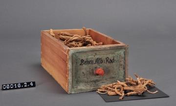 Schublade aus Nadelholz mit rotem Knauf und profilierter Vorderseite, unregelmäßigem Grundriss, individuell an den Schrank angepasst. Gezinkte Verbindungen (Schwalbenschwanzverbindung). Boden angeleimt. Vorderfront grün, mit schwarzer Signatur händisch beschriftet. Enthält weiße Behenwurzel als Ganzdroge.