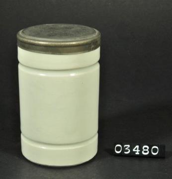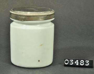 Zylindrischer, weiß glasierter Salbentopf aus Steingut. Flacher Stülpdeckel aus Metall mit geriffeltem Rand. Außen und innen glasiert. Mit je einer Rille im oberen und unteren Drittel des Gefäßes. Gefäßboden unglasiert, eben, mit Prägung (100 in einem wappenförmigen, glasierten Schild).