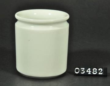 Weißer, runder zylindrischer Topf aus Steinzeug. Rille am oberen Wandrand. Ohne Stülpdeckel. Gefäßboden mit Standring und eingewölbt. Volumenangabe (10) im Boden eingeprägt.
