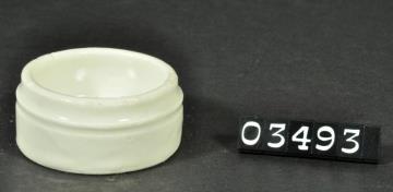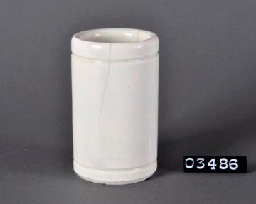 Zylindrischer, weißer Salbentopf aus Steinzeug. Mit Binderand. Gefäßboden unglasiert, mit einer glasierten runden Vertiefung mit Prägung (75). Unterer Gefäßrand nach innen abgeschrägt.
