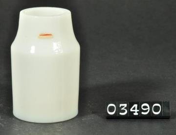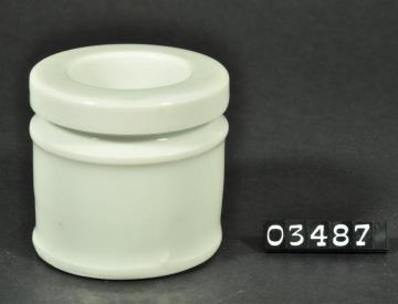 Schwerer, dickwandiger, zylindrischer Topf aus Porzellan mit leicht nach außen geschlagenem Fußrand. Planer Gefäßboden. Starke Rillenfurche im oberen Randbereich. Außen und innen glasiert, Boden unglasiert, heller Scherben. Höchstwahrscheinlich Verwendung als Tintenfass.