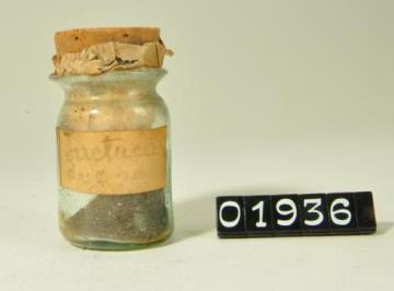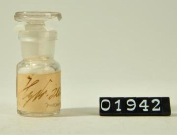 Rundes Pulverglas aus farblosem Glas mit Korkstopfen, Tektur und mit Faden verschlossen. Rot signiert
