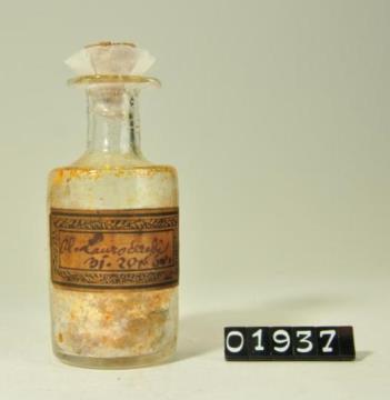 Rundes, farbloses Pulverglas mit Korkstopfen (Schliffstopfen fehlt). Verstärkter Mündungsrand. Etikett des SINDACATO AGRICOLO INDUSTRIALE TRENT0.