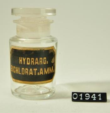 Rundes, farbloses Pulverglas mit Schliffstopfen (Hohlstopfen). Verstärkter Mündungsrand. Weiß signiert