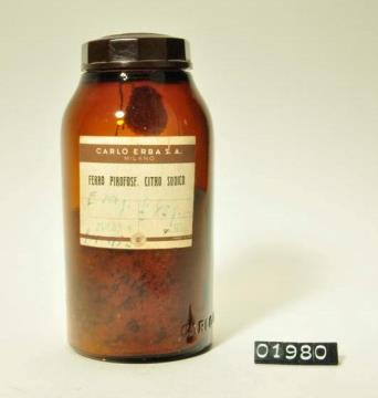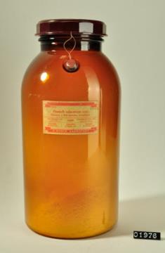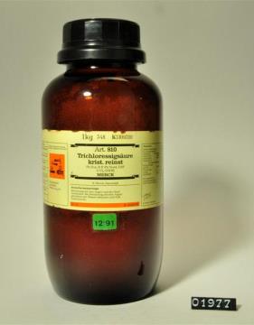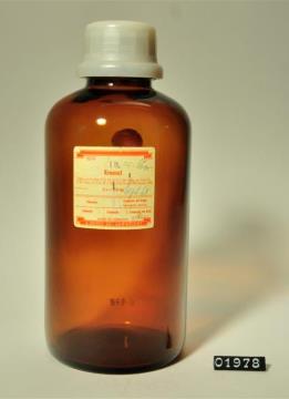 Runde, braune Enghalsflasche mit weißem Schraubverschuss. Eingekauft im September 1968 zum Preis von Lire 3.600.- (handschriftlicher Vermerk von Ignaz Peer II). Etikett der Firma Merck.