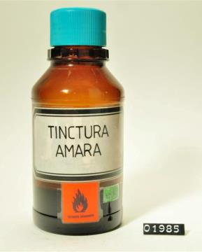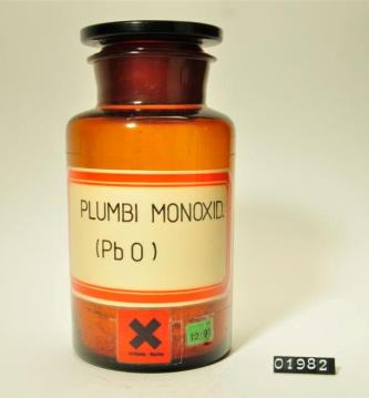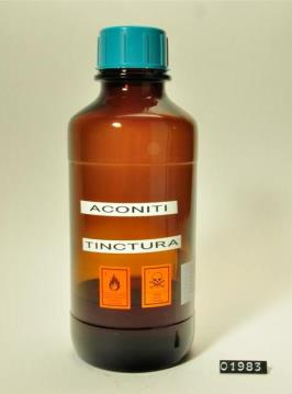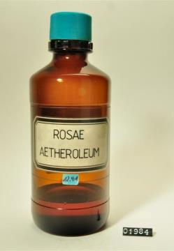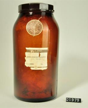 Runde, braune Weithalsflasche mit braunem Schraubverschuss. Im Dezember 1991 aus dem Sortiment genommen (grünes Schild). Etikett der Firma Merck.