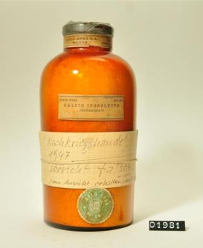 Runde, braune Weithalsflasche mit Korkstopfen, original versiegelt. Etikett und rundes Qualitätssiegel und Sicherheitsbanderole der Firma Carlo Erba. Verschlossen mit Kork und einer, mit Firmennamen eingeprägter, Metalltektur. Handgeschriebener Hinweis von Toni Kerer, dass es sich um Ware zur Ansicht handelt und nicht abgegeben werden darf. Enthält Calciumthiosulfat.