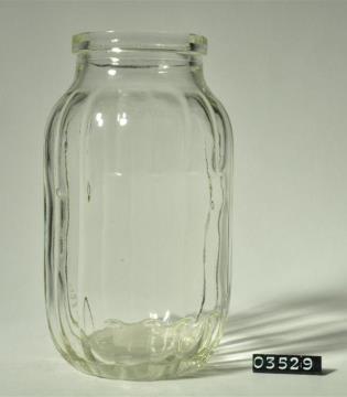 Zylindrisches, farbloses Weithalsglas mit länglichen Rillen und Aussparung für die Anbringung eines Etikettes. Oberer und unterer Teil der Wand eingewölbt. Seitliche Naht. Glatte Mündung. Boden eingewölbt, mit Standring und eingeprägtem ( Carlo Erba, Milano) Firmennamen.