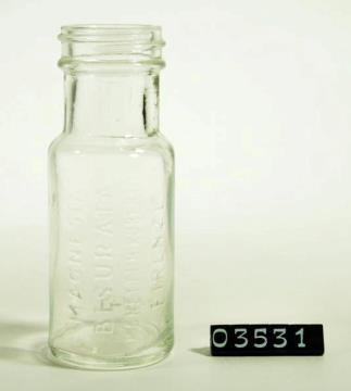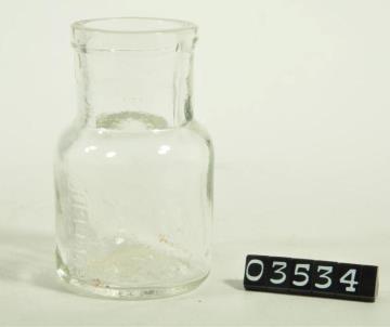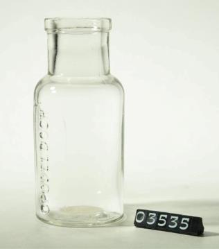 Zylinderformige, farblose Weithalsflasche mit langem Hals und verstärktem Mündungsrand. Boden leicht eingewölbt mit Pragung des Volumens (30). Seitliche Naht und seitliche, schlecht lesbare Prägung, höchstwahrscheinlich Opodeldoc.