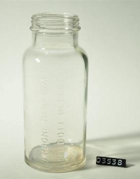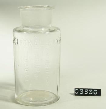 Zylindrisches, farbloses Weithalsglas mit geschliffener Mündung, jedoch ohne Schliffstopfen. Seitliche Prägung "Sulfonal" und vertikal "Farbenfabriken vorm. Fr. Bayer Elberfeld".Seitennaht. Boden mit Standring und leicht eingewölbt. Mündungsrand leicht flach ausgebogen.