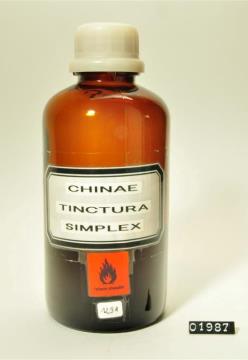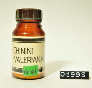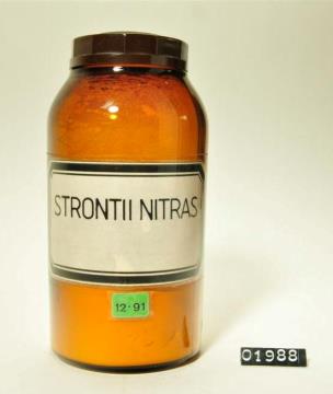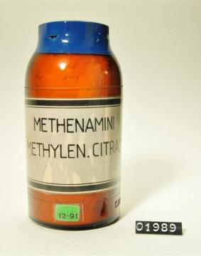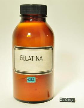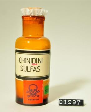 Runde, braune Weithalsflasche mit Schraubverschuss und blauer Kunststoffolie original verschlossen. Schwarz signiert