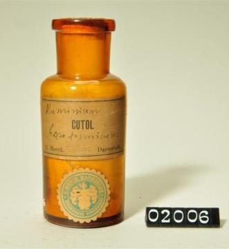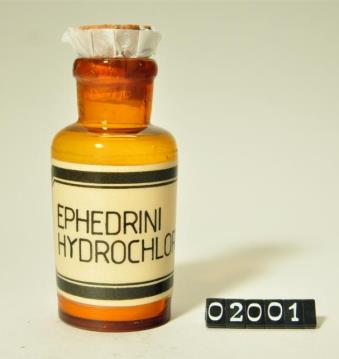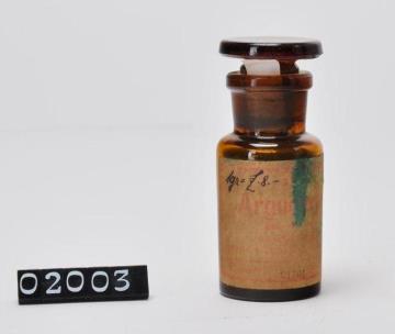 Rundes, braunes Pulverglas mit Schliffstopfen (Massivstopfen). Etikettiert, leider schlecht leserlich. Mit Inhalt. Rückseite rundes Qualitätssiegel von Merck. Verkaufspreis mit schwarzer Tinte handschriftlich vermerkt: 1gr. = Lire 8.-.
