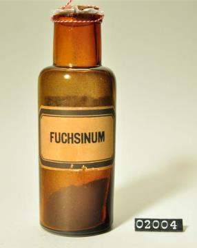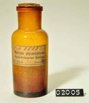 Runde, braune Weithalsflasche mit Korkstopfen. Etikett der Firma Merck. Enthält Glycocholsaures Natrium.
