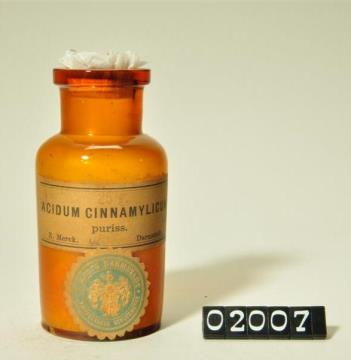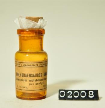 Runde, braune Weithalsflasche mit Korkstopfen. Etikett der Firma Merck.
