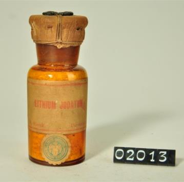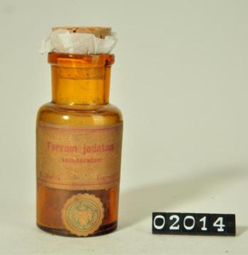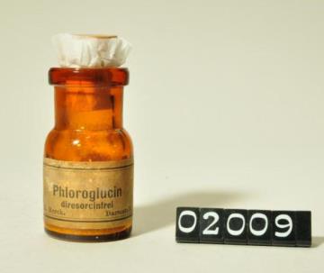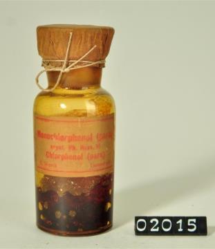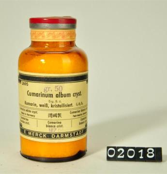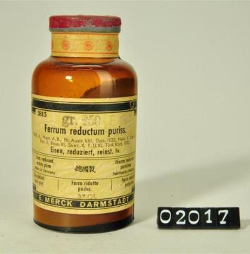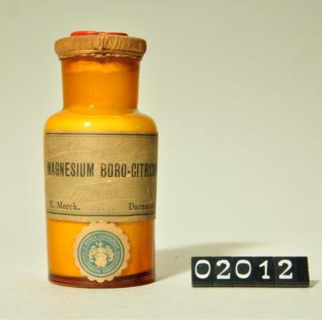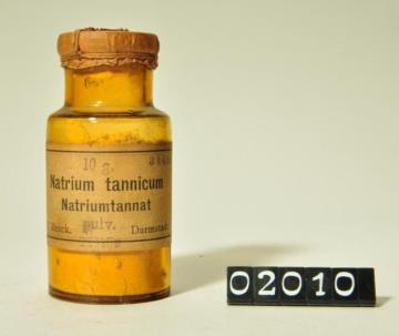 Runde, braune Enghalsflasche mit Korkstopfen und Metallkappe original verschlossen. Im Dezember 1991 aus dem Sortiment genommen (grünes Schild). Etikett der Firma Merck.
