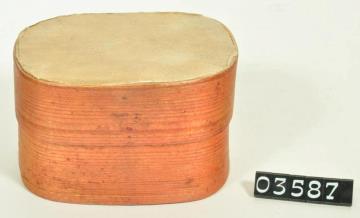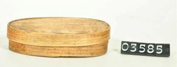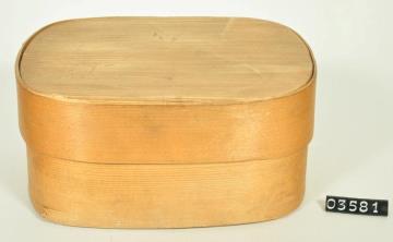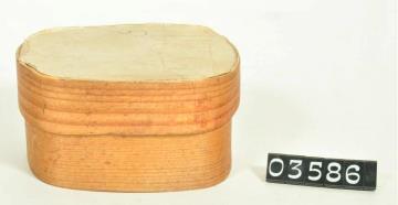 Hellbraune, im Grundriss rechteckige Spanschachtel mit abgerundeten Ecken und Stülpdeckel. Unsigniert. Leer.