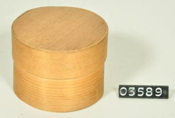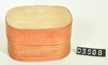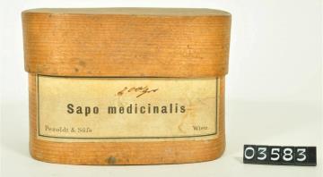 Hellbraune, im Grundriss leicht unregelmäßig-rechteckige Spanschachtel mit abgerundeten Ecken und Stülpdeckel. An der Seitenwand Etikett der Firma Pezoldt & Süßs, Wien. Enthielt medizinische Seife. Leer.