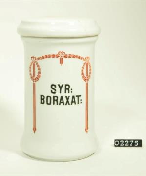 Zylindrischer dünnwandiger Salbentopf aus Porzellan mit Standring und glockenförmigen Hohldeckel mit Steckzarge und massivem, zentralem runden Knauf. Hohlkehlen vergoldet. Signiert und reich farblich dekoriert. Am Boden Manufakturstempel: Paul Lefébure aus Paris. Enthielt Theriak.