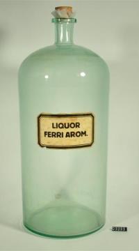 Hellgrüne zylindrische Glasflasche mit verstärktem Mündungsrand und Korkstopfen. Mit Signierapparat bedrucktes Papierschild, achteckig, mit schwarzem Doppelrand und schwarzer Schrift auf ehemals weißem Grund. Mit Schilderlack überzogen.