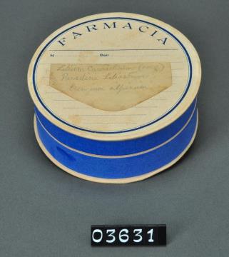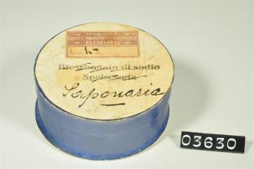 Runde Pulverschachtel aus Karton ohne Falz mit Stülpdeckel. Dose mit blauem Glanzpapier überzogen. Darauf Etikett der Brixner Hofapotheke. Dose ursprünglich für Speisesoda genutzt, dann für Seifenkraut recycelt. Deckel außen mit " Bicarbonato die sodio - Speisesoda" gestempelt, dann durchgestrichen und mit schwarzer Tinte beschriftet. Ohne Inhalt.