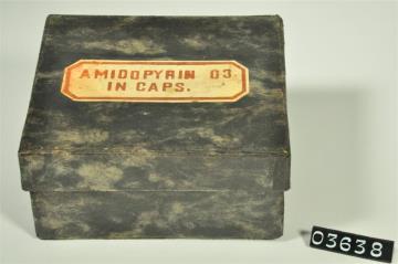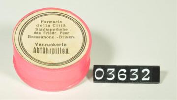 Runde Pillenschachtel, ohne Falz mit rosa bzw. blauem Glanzpapierbezug. Mit Firmenetikett der Stadtapotheke des Friedr. Peer. Darin noch eine Pille.