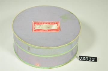 Runde Pulverschachtel mit Falz, mit hellviolettem Glanzpapier überzogen. Darauf mit Tinte beschriftetes Etikett der Stadtapotheke des Ignaz Peer I. Beschriftung z.Z. noch nicht zuordnungsbar. Innenseite des Deckels mit Bleistift beschriftet: Datum 10/7 879 und Preis = 20 und mit Stempelmarke des Herstellers Joseph Gross aus Wien. Ohne Inhalt.
