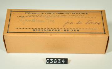 Rechteckige, braune Faltschachtel für Tee mit einfarbigem, zweisprachigem Firmeneindruck der Fürstbischöflichen Hofapotheke aus Brixen. Darin Pfunderer Tee ohne Innensack. Handschriftliche Ergänzung: per la tosse.