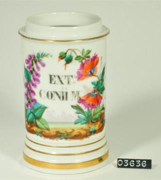Zylindrischer dünnwandiger Salbentopf aus Porzellan mit Standring und Stülpdeckelrand. Ohne Deckel. Signtur reich mit Blumenmotiven umrandet. Wülste vergoldet. Am Boden Manufakturstempel: L. Caut, 30 30 Rue des Francs Bourgeois, Paris. Enthielt einen Extrakt des gefleckten Schierlings.