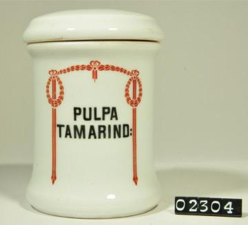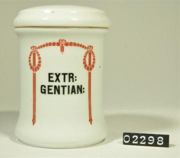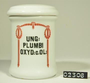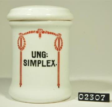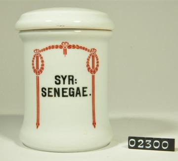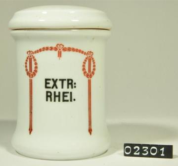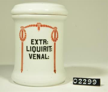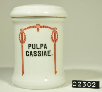 Zylinderförmiger Porzellantiegel mit Stülpdeckelrand, geschweiftem Rand und geschweiftem Fuß. Stülpdeckel mit Kehlung. Standring. Standboden plan. Jugendstilähnliche, rotbraune Randdekoration (Blattgirlande mit Bändern). Eingebrannte schwarze Signatur.