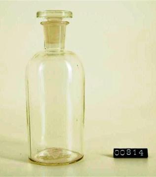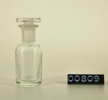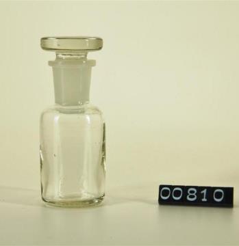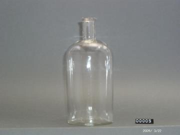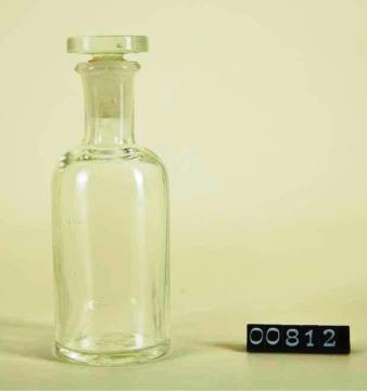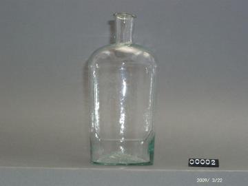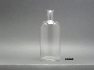 Enghalsflasche ohne Stopfen; maschinell hergestellt, Seitennaht, manuell aufgesetzter Hals mit nachgearbeitetem Mündungsrand, farbloses Glas. Zylindrischer Flaschenkörper mit runder Schulter. Nach oben gewölbter Boden mit Prägung der Inhaltsangabe. An der Wand rechteckige Prägung mit abgeschnittenen Ecken für Etiketten.