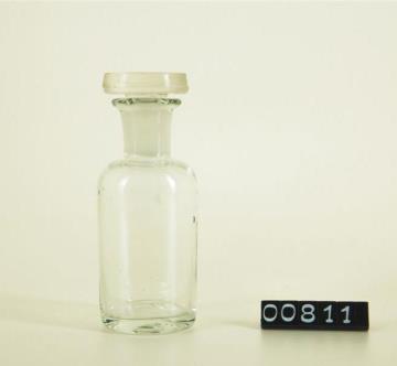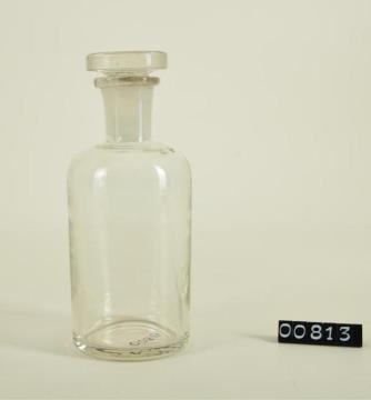 Farbloser zylindrischer Flaschenkörper mit runder Schulter und kurzem Zylinderhals mit verstärktem Mündungsrand. Ohne Stopfen. Mit Bodenprägung.