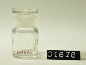 Rundes Pulverglas aus farblosem Glas mit Schliffstopfen (Massivstopfen). Verdickter, flacher Mündungsrand.