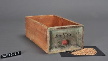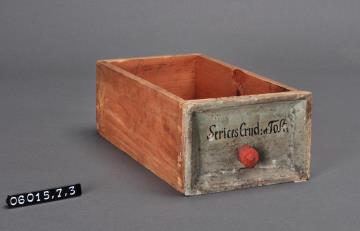 Schublade aus Nadelholz mit rotem Knauf und profilierter Vorderseite, unregelmäßigem Grundriss, individuell an den Schrank angepasst. Gezinkte Verbindungen (Schwalbenschwanzverbindung). Boden angeleimt. Vorderfront grün, mit schwarzer Signatur händisch beschriftet. Enthält Veilchen-Samen als Ganzdroge.
