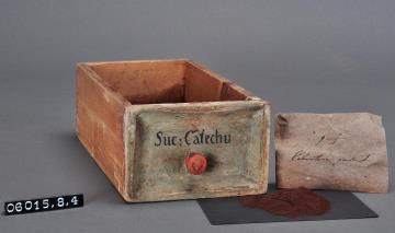 Schublade aus Nadelholz mit rotem Knauf und profilierter Vorderseite, unregelmäßigem Grundriss, individuell an den Schrank angepasst. Gezinkte Verbindungen (Schwalbenschwanzverbindung). Boden angeleimt. Vorderfront grün, mit schwarzer Signatur händisch beschriftet. Enthält Japanische Erde und einen Zettel mit historischer Beschriftung "1 Libra Catechu pulv. I".