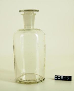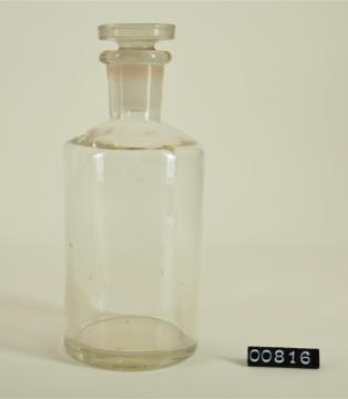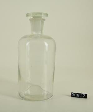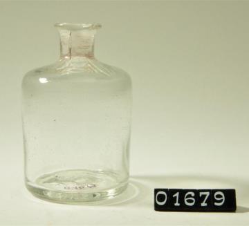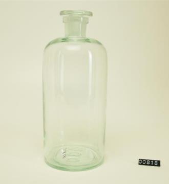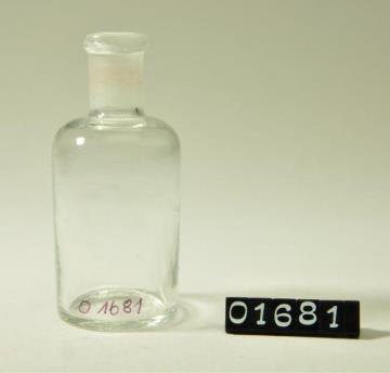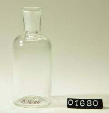 Runde Enghalsflasche aus farblosem Glas, leicht eingewölbter Boden, runde Schulter. Mit Schliffstopfen.