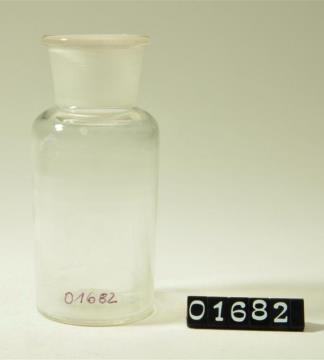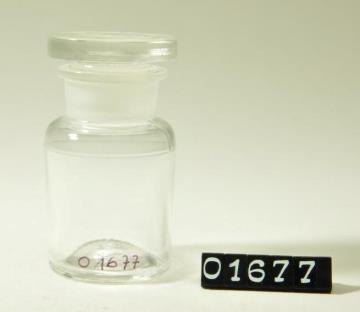 Rundes Pulverglas aus farblosem Glas mit Schliffstopfen (Massivstopfen). Verdickter, flacher Mündungsrand.