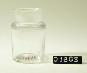 Rundes Pulverglas aus farblosem Glas ohne Stopfen. Ausladender, flacher Mündungsrand.