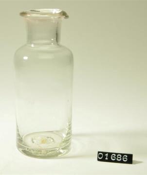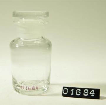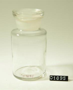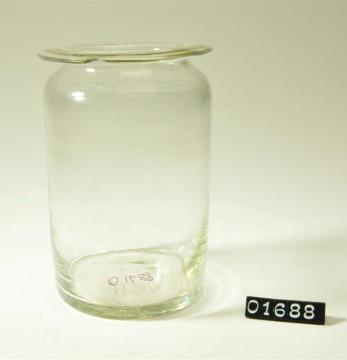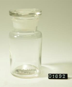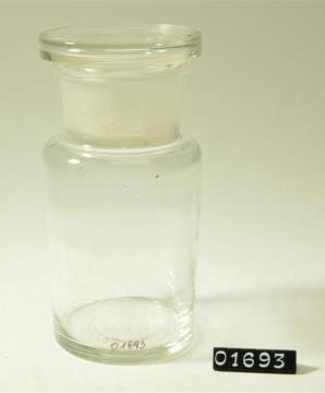 Rundes Pulverglas aus farblosem Glas mit Schliffstopfen. Hohlstopfen mit Hefteisenabriss. Ausladender, flacher Mündungsrand.