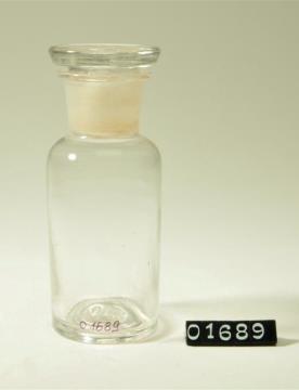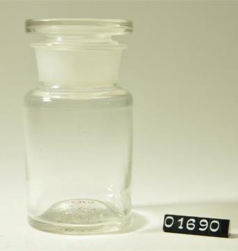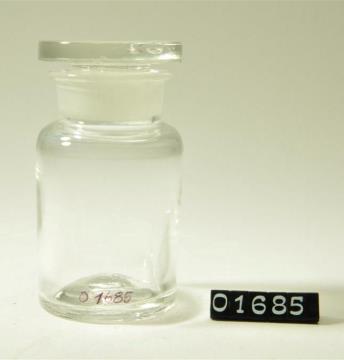 Rundes Pulverglas aus farblosem Glas mit Schliffstopfen (Massivstopfen). Boden mit abgeschliffenem Hefteisenabriss. Ausladender, flacher Mündungsrand.
