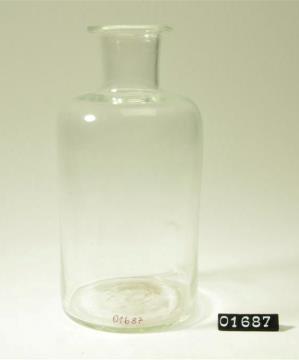 Runde Weithalsflasche aus farblosem Glas mit Schliffstopfen. Holstopfen mit Hefteisenabriss. Verdickter, ausladender Mündungsrand.