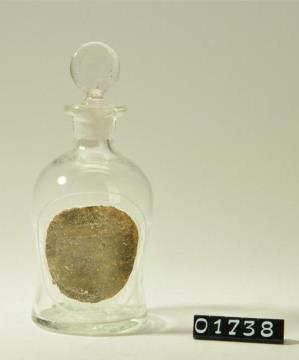 Standflasche aus farblosem Glas mit bauchigem Oberteil und Schliffstopfen mit scheibenförmigem Griff (Massivstopfen). Hefteisenabriss, Mündungsrand mit wulstartiger Verdickung. Ovales Goldschild in Kaltmalerei mit weißlich mattem Dekorrahmen.