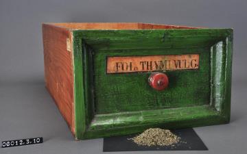 Schublade aus Nadelholz mit rotem Knauf und profilierter Vorderseite. Profil aufgeleimt und mit Holznägeln gesichert. Gezinkte Verbindungen (Schwalbenschwanzverbindung). Boden angeleimt und ebenfalls mit Holznägeln gesichert. Vorderfront grün, mit aufgeklebter, schwarz umrandeter, bräunlicher Papiersignatur. Am linken Seitenteil altes, gezahntes Preisschild. Enthält Thymian-Blätter, geschnitten.