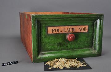 Schublade aus Nadelholz mit rotem Knauf und profilierter Vorderseite. Profil aufgeleimt und mit Holznägeln gesichert. Gezinkte Verbindungen (Schwalbenschwanzverbindung). Boden angeleimt und ebenfalls mit Holznägeln gesichert. Vorderfront grün, mit aufgeklebter, schwarz umrandeter, bräunlicher Papiersignatur. Preisschild auf Oberseite der Vorderfront. Enthält Lorbeer-Blätter, geschnitten.