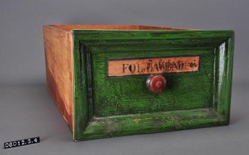 Schublade aus Nadelholz mit rotem Knauf und profilierter Vorderseite. Profil aufgeleimt und mit Holznägeln gesichert. Gezinkte Verbindungen (Schwalbenschwanzverbindung). Boden angeleimt und ebenfalls mit Holznägeln gesichert. Vorderfront grün, mit aufgeklebter, schwarz umrandeter, bräunlicher Papiersignatur. Enthält Orangen-Blätter, geschnitten.