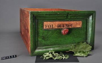 Schublade aus Nadelholz mit rotem, teilweise abgeschlagenem Knauf und profilierter Vorderseite. Profil aufgeleimt und mit Holznägeln gesichert. Gezinkte Verbindungen (Schwalbenschwanzverbindung). Boden angeleimt und ebenfalls mit Holznägeln gesichert. Vorderfront grün, mit aufgeklebter, schwarz umrandeter, bräunlicher Papiersignatur. Enthält Eichen-Blätter, lat. korrekt: Folia Quercus, ganz und geschnitten.