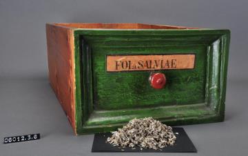 Schublade aus Nadelholz mit rotem Knauf und profilierter Vorderseite. Profil aufgeleimt und mit Holznägeln gesichert. Gezinkte Verbindungen (Schwalbenschwanzverbindung). Boden angeleimt und ebenfalls mit Holznägeln gesichert. Vorderfront grün, mit aufgeklebter, schwarz umrandeter, bräunlicher Papiersignatur. Enthält Salbei-Blätter, geschnitten.